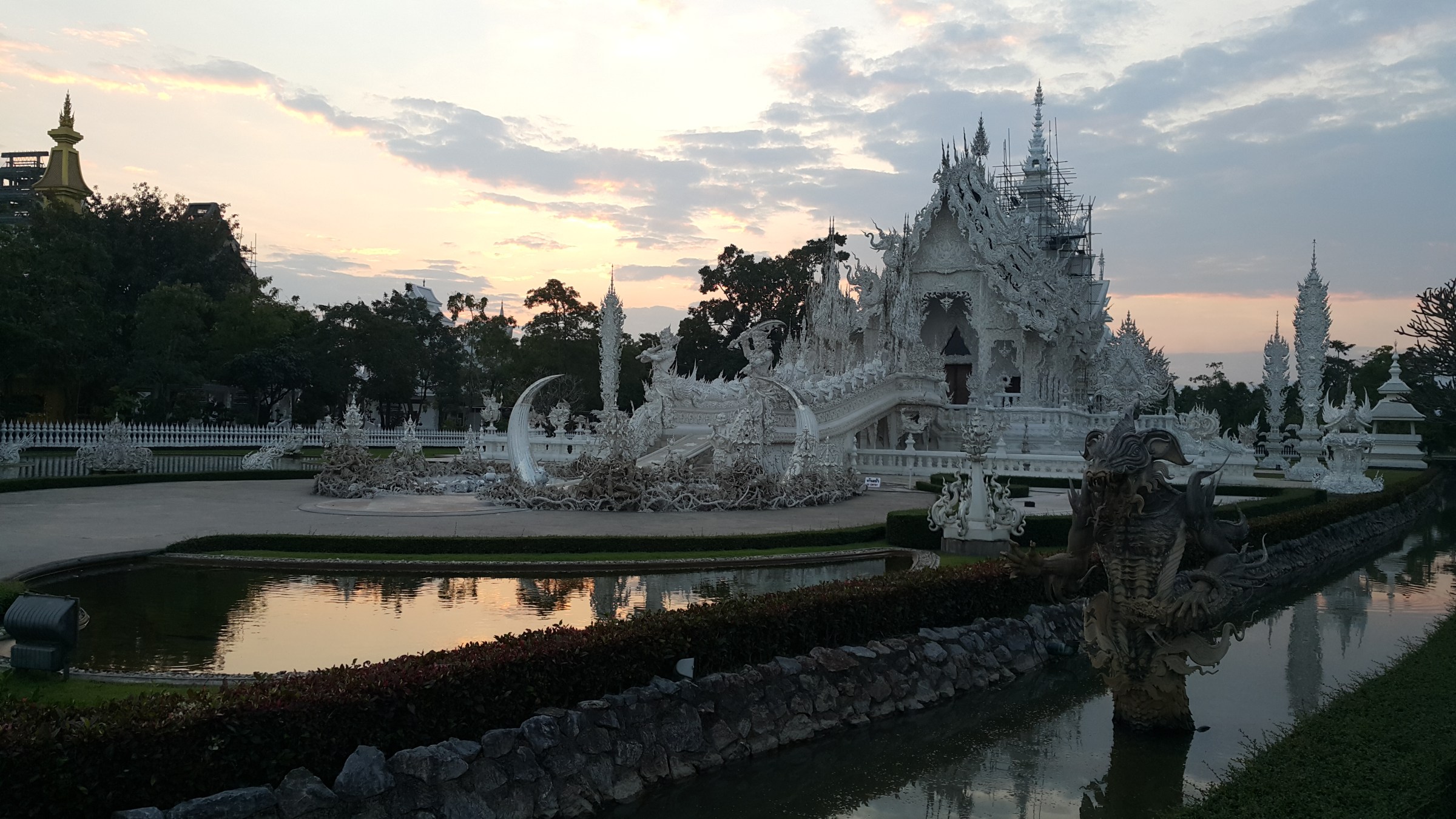 Llevamos un tiempo pensando que todos los templos son iguales pero con éste nos hemos equivocado. Cuando lo vimos nos quedamos con la boca abierta, es impresionante! Y todo lo que tiene de bonito lo tiene también de raro. Es un templo bastante nuevo, de la década de los 90 (de hecho está sin terminar) y, parece ser, que al arquitecto le debía gustar la película Aliens vs Predator porque el templo está ambientado en ella. Además, en su interior, hay pinturas en las que aparecen un montón de personajes de ficción, desde Superman hasta Matrix, pasando por Doraemon! Nos atrevemos a decir que es el templo más bonito que hemos visto en Tailandia y cuando lo terminen va a ser espectacular!