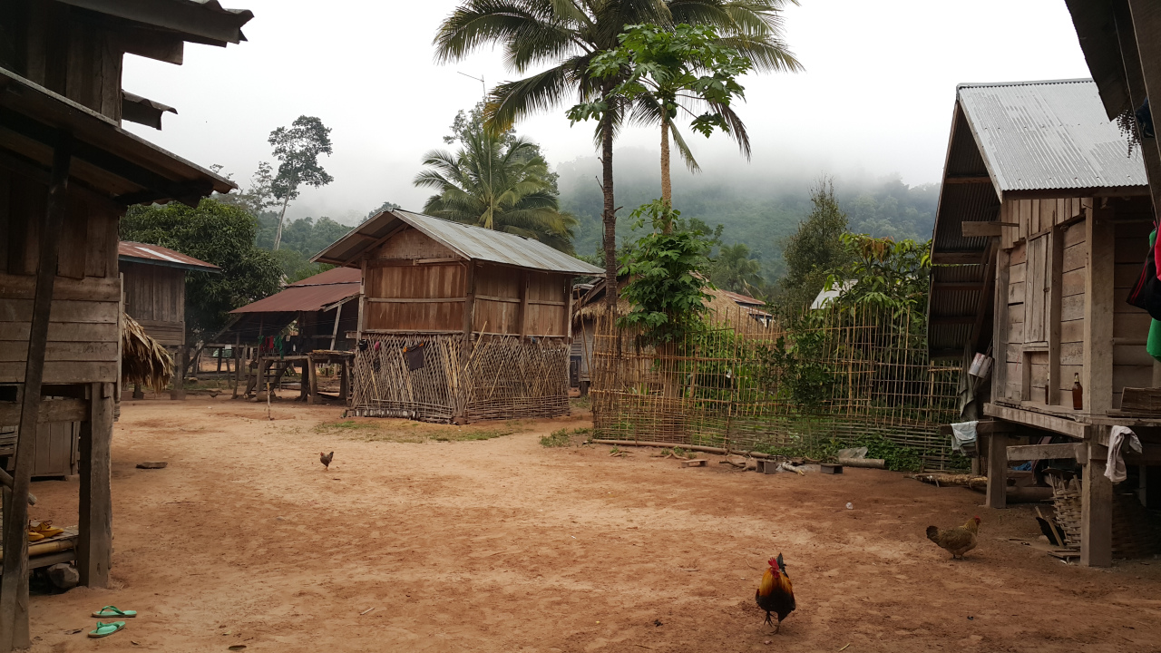 A las 5 de la mañana, con el canto de los gallos, todo el mundo estaba en pie. Nosotros remoloneamos un poco más. La verdad es que dormir habíamos dormido poco en ese suelo tan duro, escuchando sonidos «extraños» en el exterior y pensando que la puerta estaba abierta y que cualquier bicharraco podía entrar en cualquier momento! Cuando nos levantamos, y notando los efectos del lao lao de la noche anterior, fuimos a dar un paseo por el pueblo. Estaba totalmente desértico, cada uno estaba ya con sus quehaceres diarios.