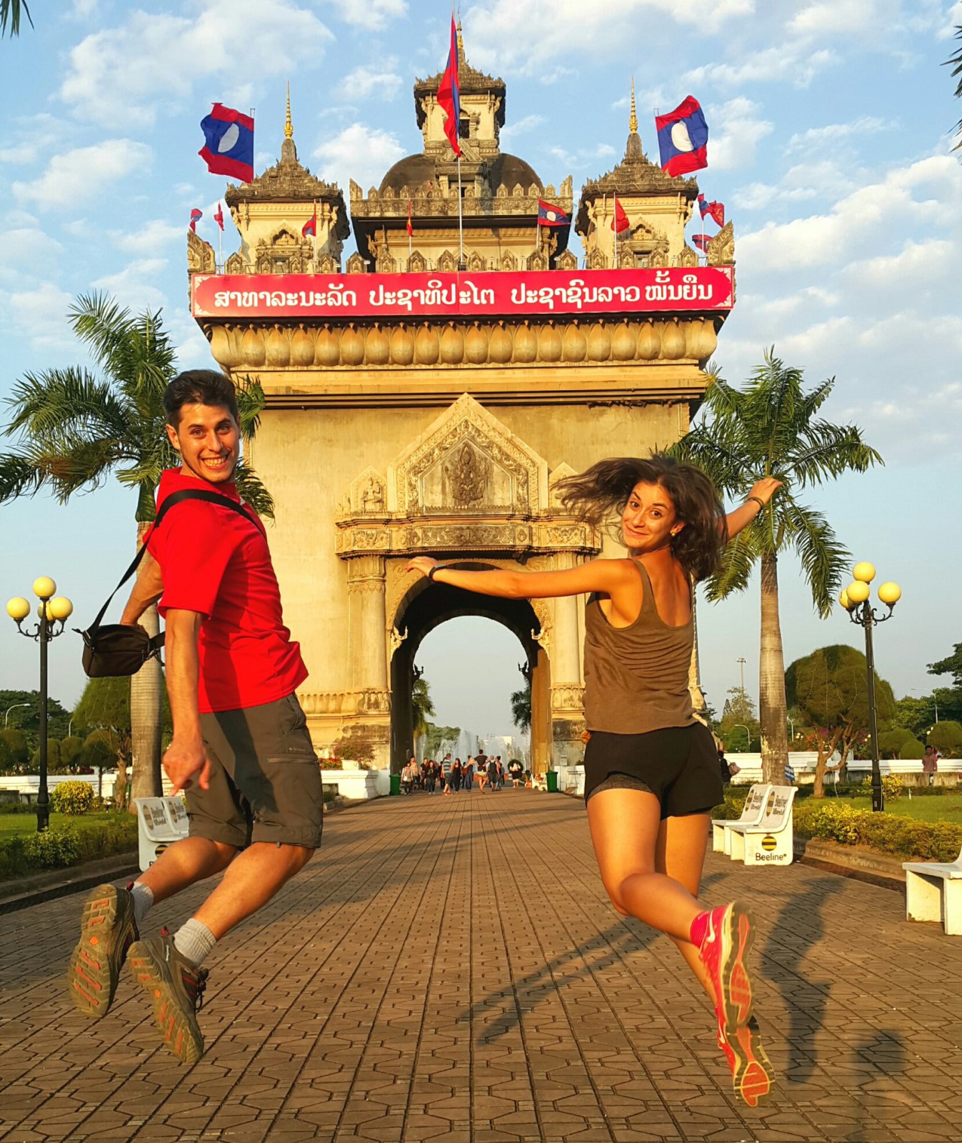 La última parada la hicimos en Patuxai, (Puerta de la Victoria) construído durante los años 60 en memoria de los fallecidos en la guerra de la independencia de Laos frente a Francia. Nos pareció que tenía un cierto parecido con el Arco del Triunfo de París, situado en una gran avenida y rodeado de unos bonitos jardines. Se puede subir por 3.000 kips (0,35€) y desde arriba se puede ver toda la avenida que desemboca en el Palacio Presidencial.