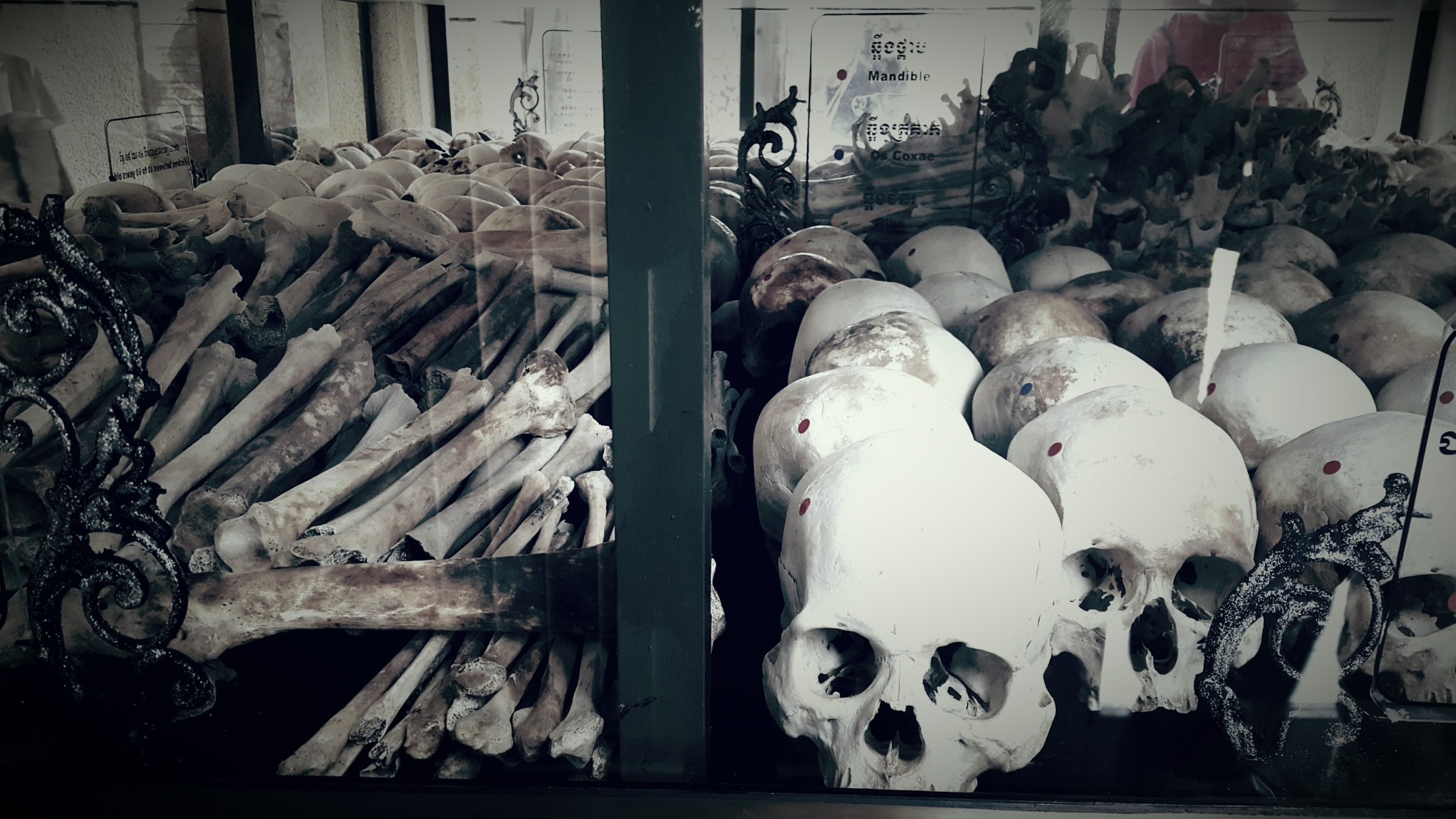 A la salida hay una pagoda para conmemorar a las miles de personas que allí murieron donde están depositados sus cráneos, huesos y ropas.