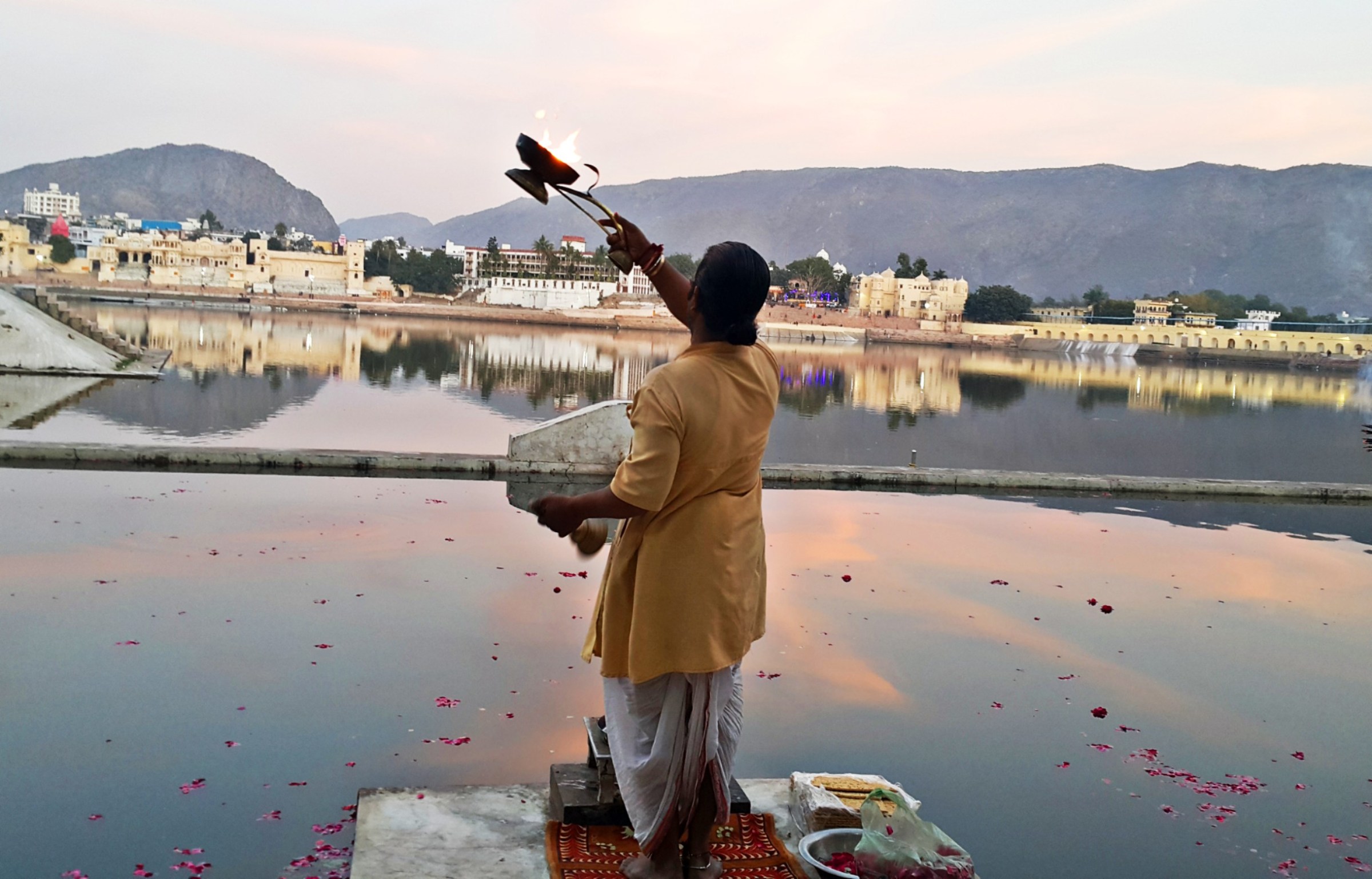 Todos los días antes del atardecer se hace una ceremonia religiosa en el lago. Tres personas de la casta de los brahmanes, que es la casta de los sacerdotes y la más alta en el hinduismo, guían la ceremonia y por un momento los mantras y cánticos religiosos, el fuego y el incienso inundan el ambiente.