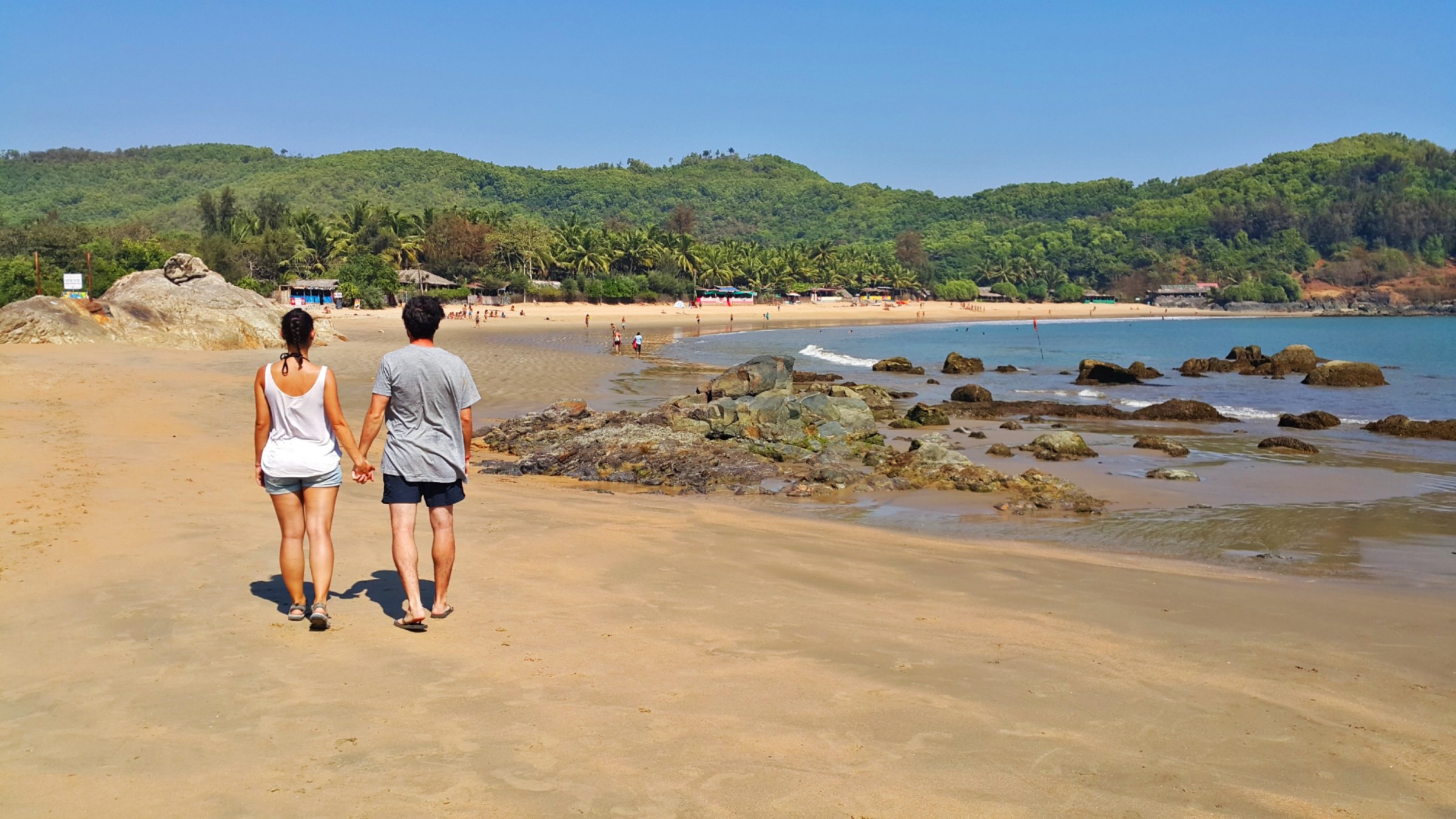 Hasta aquí llegamos andando desde la anterior. Es una playa en forma de OM, figura espiritual y religiosa. Se divide en dos partes que forman dos bahías unidas con unas rocas. La primera bahía es menos transitada que la segunda y aquí aprovechamos toda una mañana para descansar y Mario para jugar a fútbol con unos chavales de Bangalore que había allí de vacaciones.