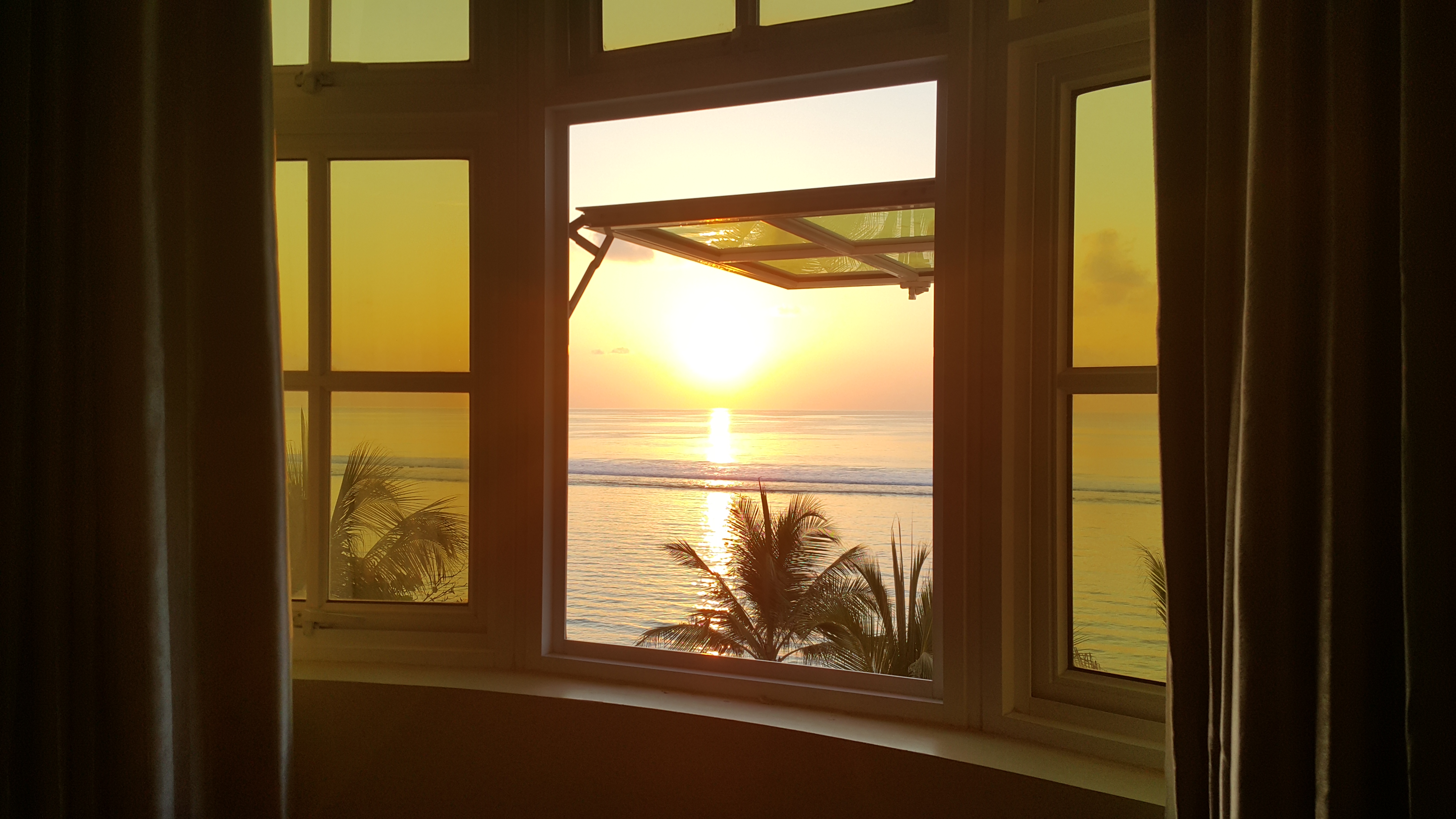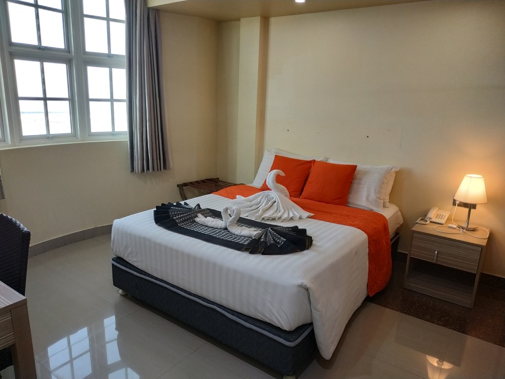 Nuestra habitación tenía vistas al mar y desde la cama pudimos ver un amanecer muy bonito. Estaba muy bien equipada con aire acondicionado, wifi, televisión, frigorífico, agua, té y café y una tetera. También teníamos en la habitación toallas, que nos dieron la bienvenida con unas formas muy bien trabajadas, y albornoces.