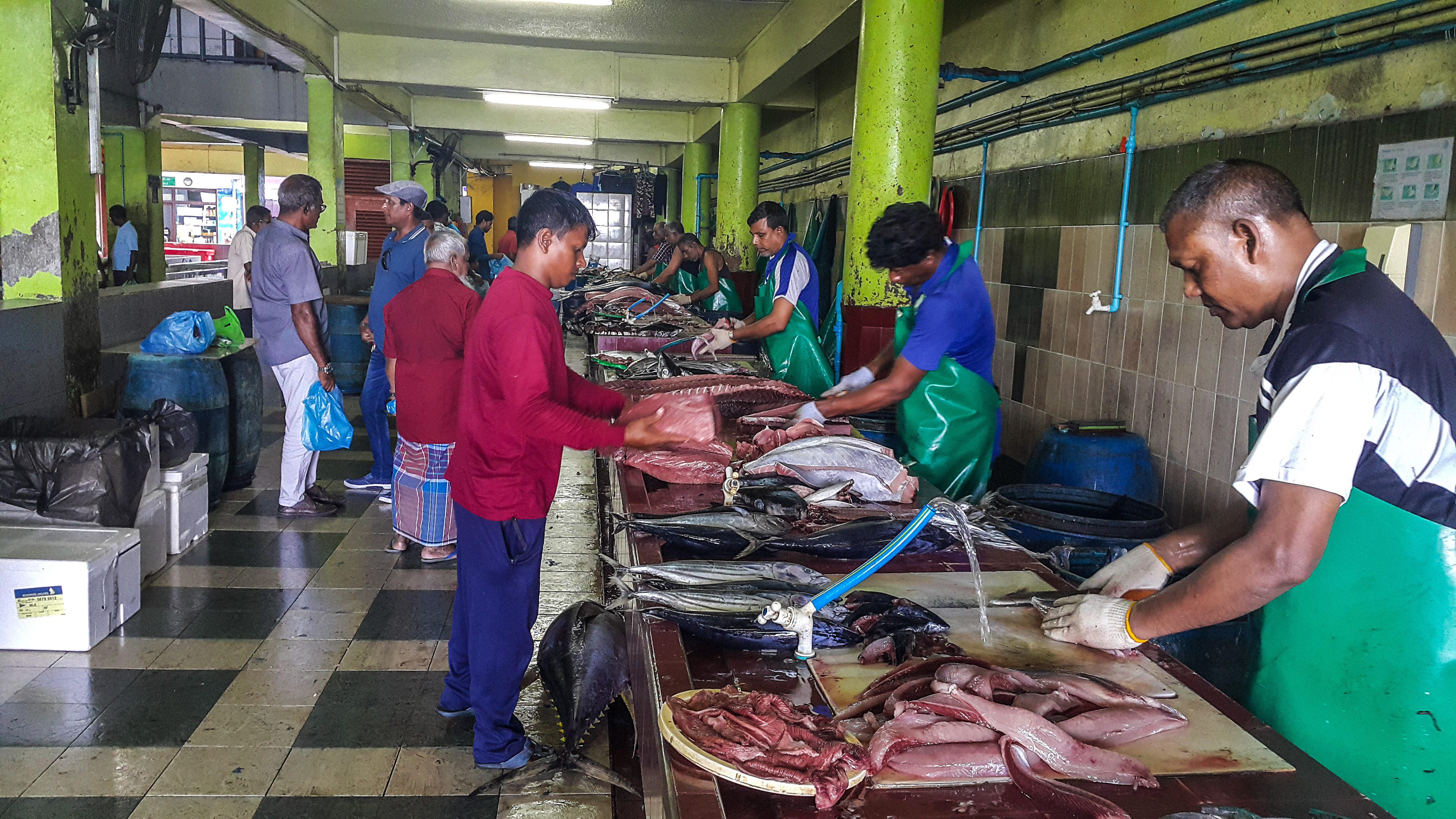 Pescado es una de las pocas cosas que tiene Maldivas y ver cómo llegan los barcos llenos de pescado, lo traen al mercado, lo pesan, lo limpian, lo venden, es alucinante. No sé si habíamos visto alguna vez tanto pescado junto, ni tan grandes! Porque menudos atunes había! Algunos pesaban hasta 120 kg. El atún es el pescado estrella en el país, así que prepárate para comerlo en todas las versiones posibles y a cualquier hora. La buena noticia es que está buenísimo!