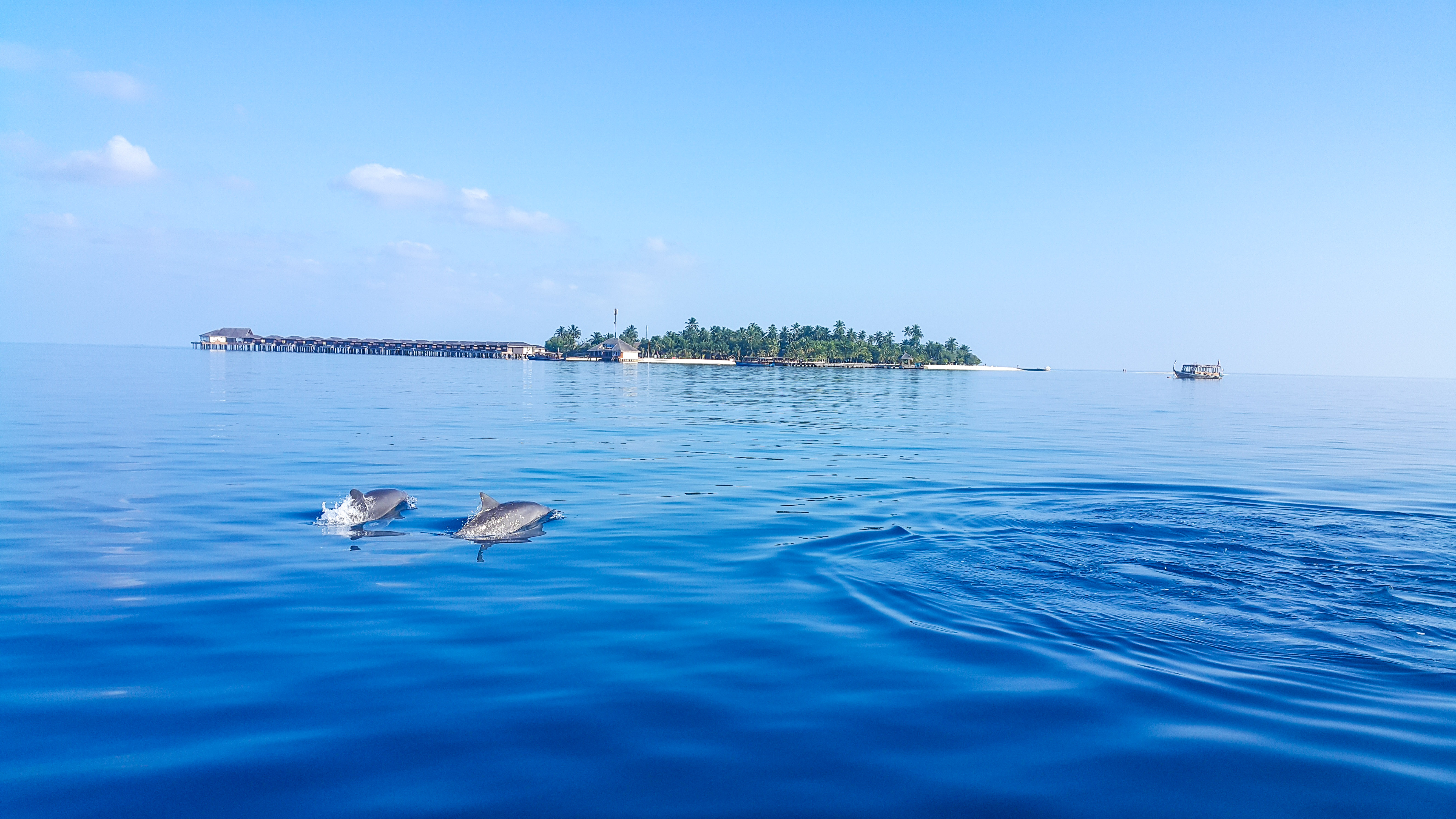 Ver delfines es bastante fácil en Maldivas y uno de esos lugares donde se pueden ver es en Fulidhoo. No lo sabíamos, no íbamos buscándolos y, de repente, aparecieron. Empezaron a saltar y a juguetear con la pequeña ola que dejaba el barco. Y había tanta calma y tranquilidad en ese lugar que podíamos escuchar hasta cómo respiraban.