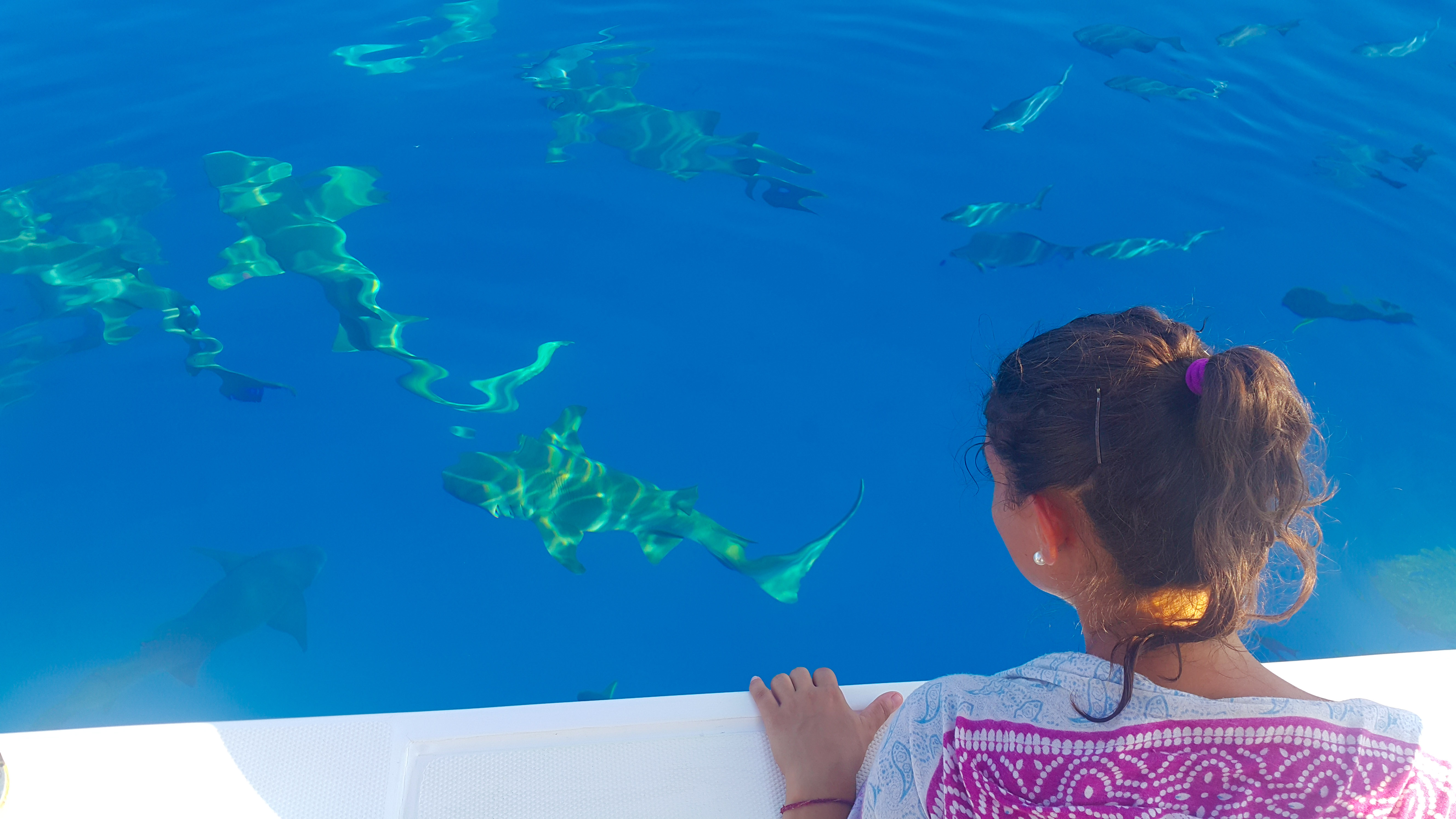 Muy cerquita de la isla, a unos 20 minutillos en barco, hay una zona en la que se pueden ver tiburones nodriza. Y esto fue, sin duda, otra de las cosas que más disfrutamos en nuestro viaje. Cuando nos íbamos acercando con el barco empezamos a ver unas manchas debajo nuestra. El agua está tan clara que se veían perfectamente desde el barco. Y no había ni uno ni dos, había decenas!