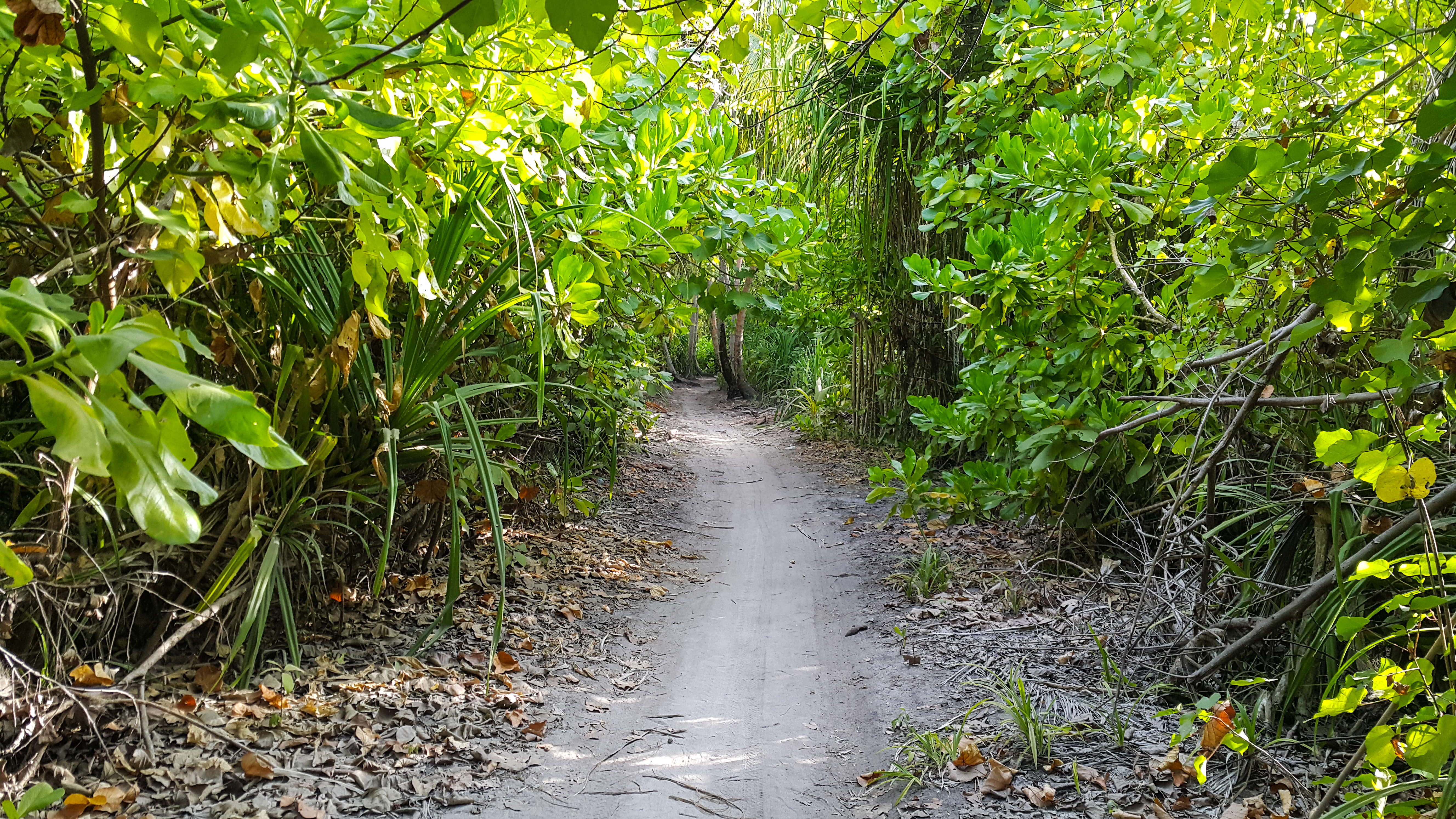 La isla acaba en una lengua de arena muy larga. Para llegar hasta allí hay que caminar como 2-3 km y se puede hacer tanto por la orilla de la playa como por el centro de la isla. Por el centro se atraviesa un tramo de vegetación tropical y se va muy bien porque hay sombrita. La verdad es que nos pareció un paseo muy chulo, que se puede hacer también en bici.