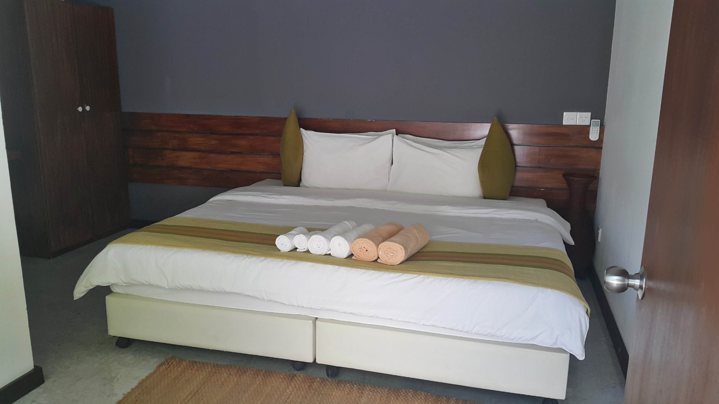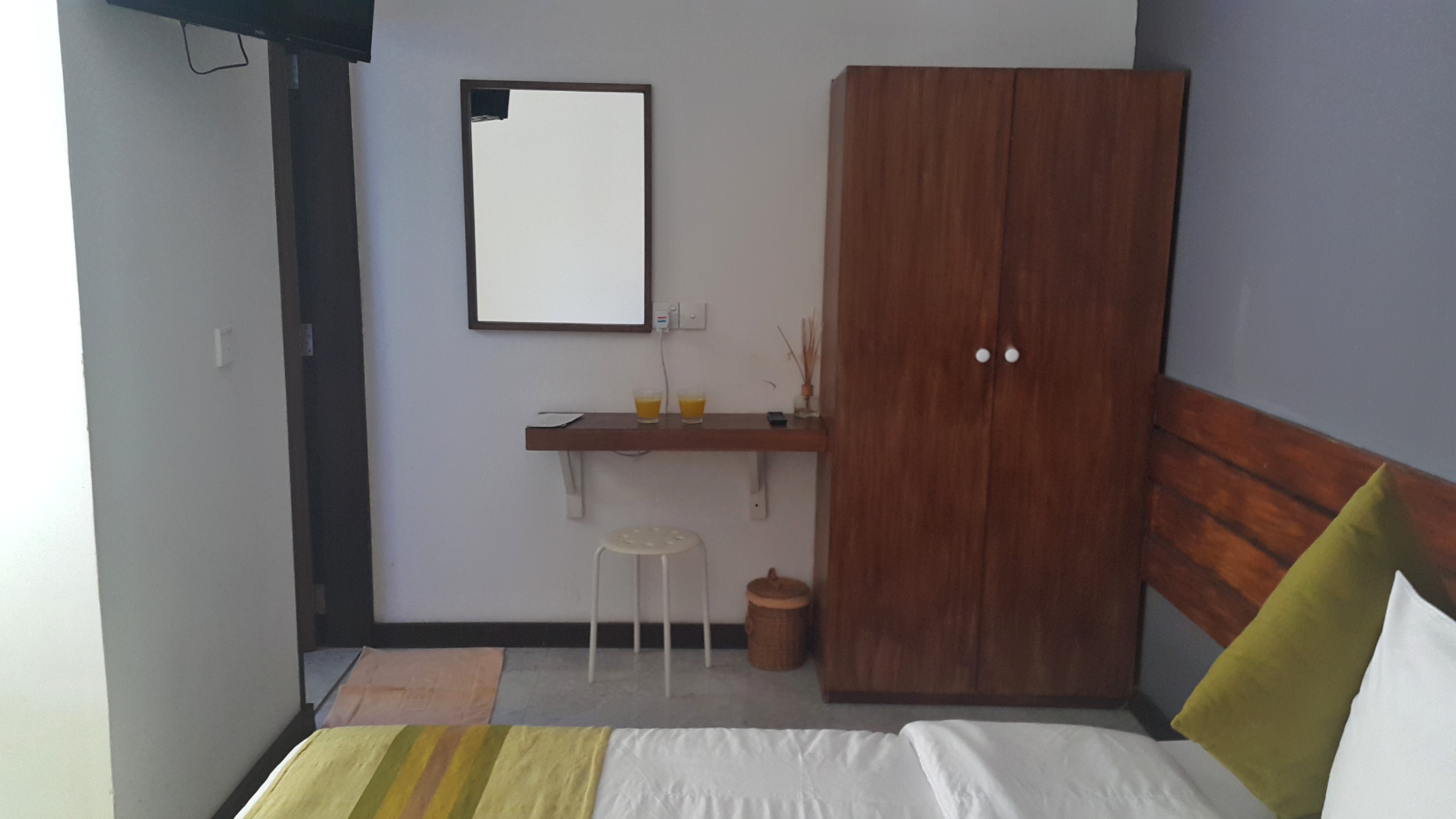 Nuestra habitación nos gustó mucho. Era bastante amplia y con una decoración muy bonita. En la entrada teníamos una mesa con sillas y un grifo para limpiarnos los pies de arena. Dentro de la habitación, la cama era grande y cómoda y teníamos una neverita pequeña, agua, té y café.