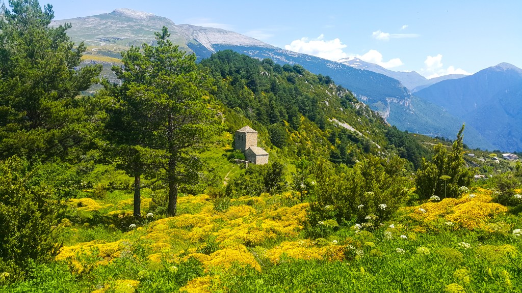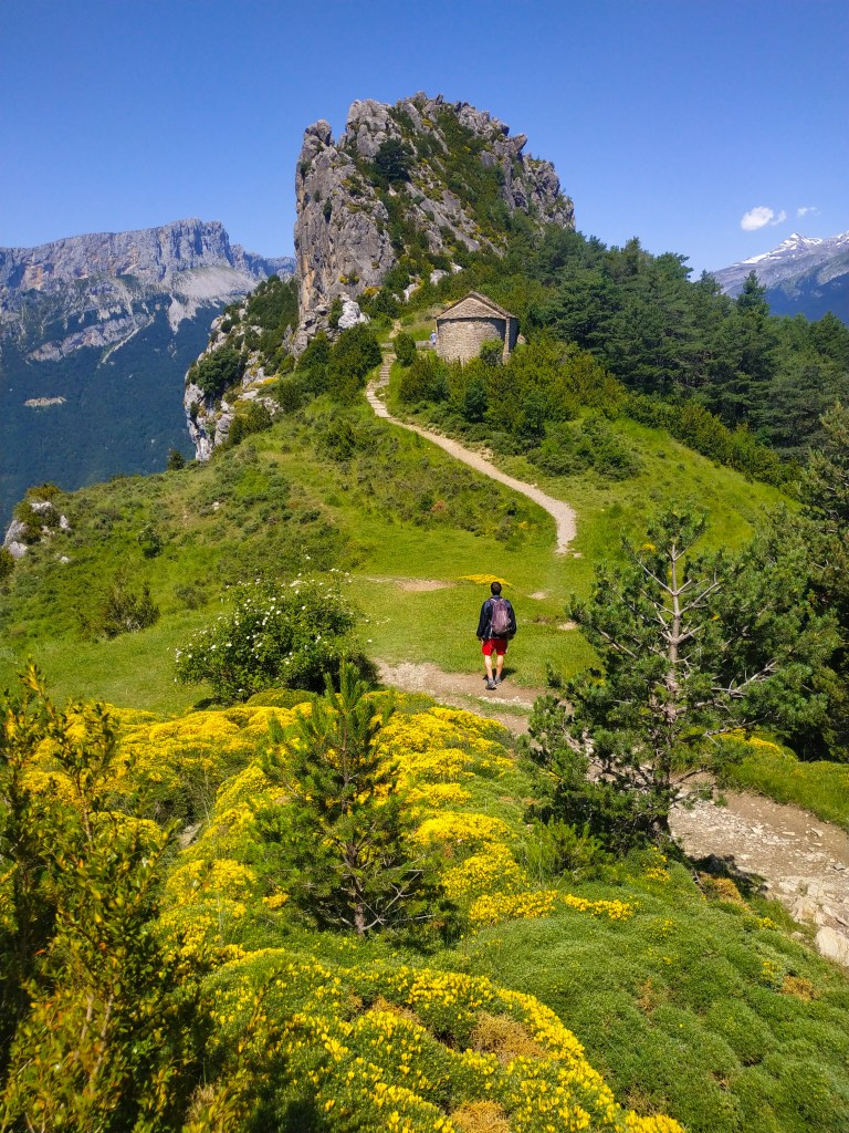 Justo enfrente está la última ermita, la Ermita de la Virgen de la Peña. Para llegar a ella hay que ascender un poco a la cima de una colina (nada complicado). Su localización sirve como mirador de la zona, con la ermita de la Virgen de las Fajanillas enfrente, el pueblo de Tella al fondo flanqueado por las montañas de los Pirineos y con los colores verdes y amarillos como protagonistas.